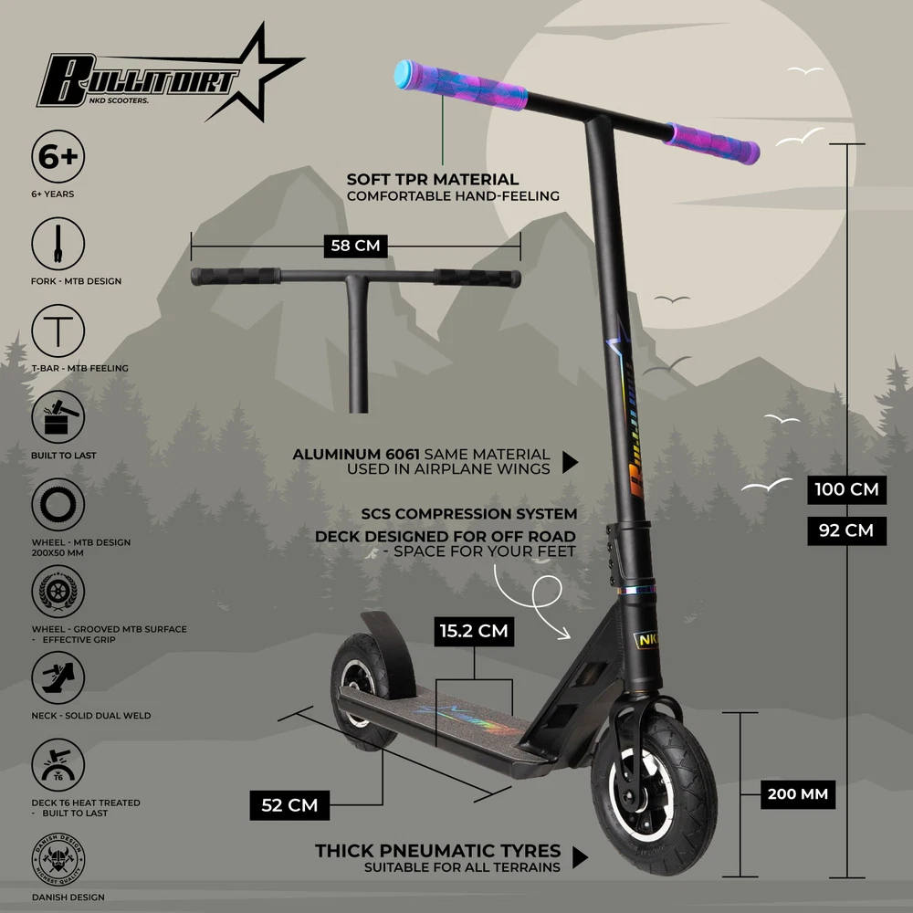 Przeżyj niezapomnianą przygodę off-roadową z naszą hulajnogą HIGH END DIRT TRICKS od NKDscooter, zaprojektowaną specjalnie dla dzieci i dorosłych w wieku od 6 lat.