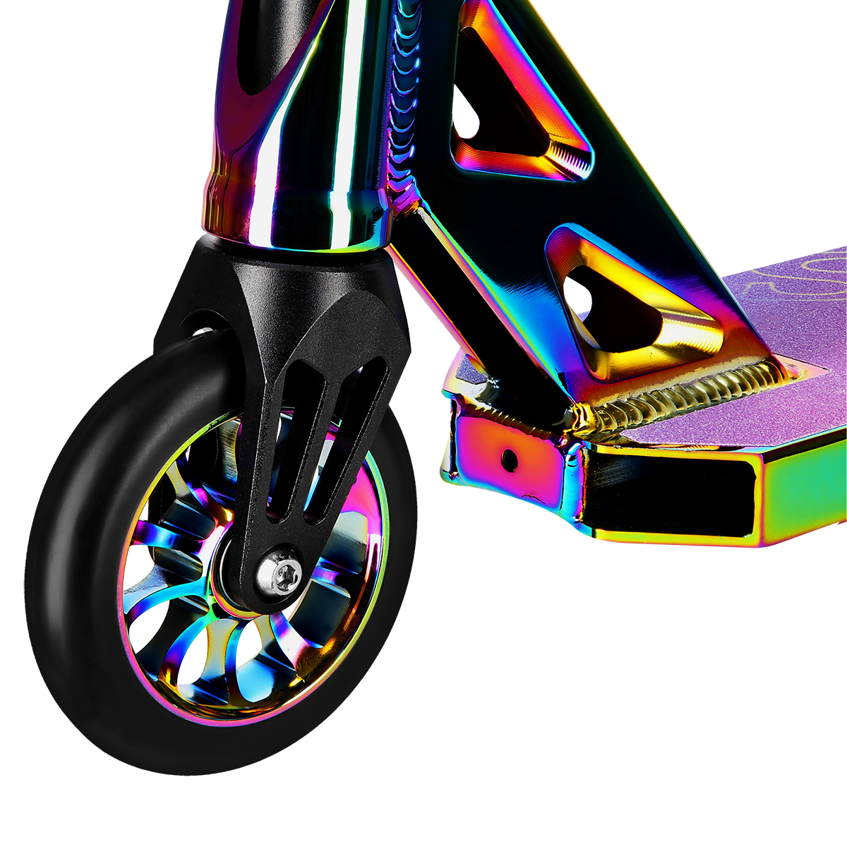 Hulajnoga posiada solidny, trzykomorowy deck oraz szeroką, wzmacnianą dodatkowymi spawami kierownicę co umożliwi satysfakcjonujące wykonywanie trików zarówno początkującym, jak i zaawansowanym stunterom.