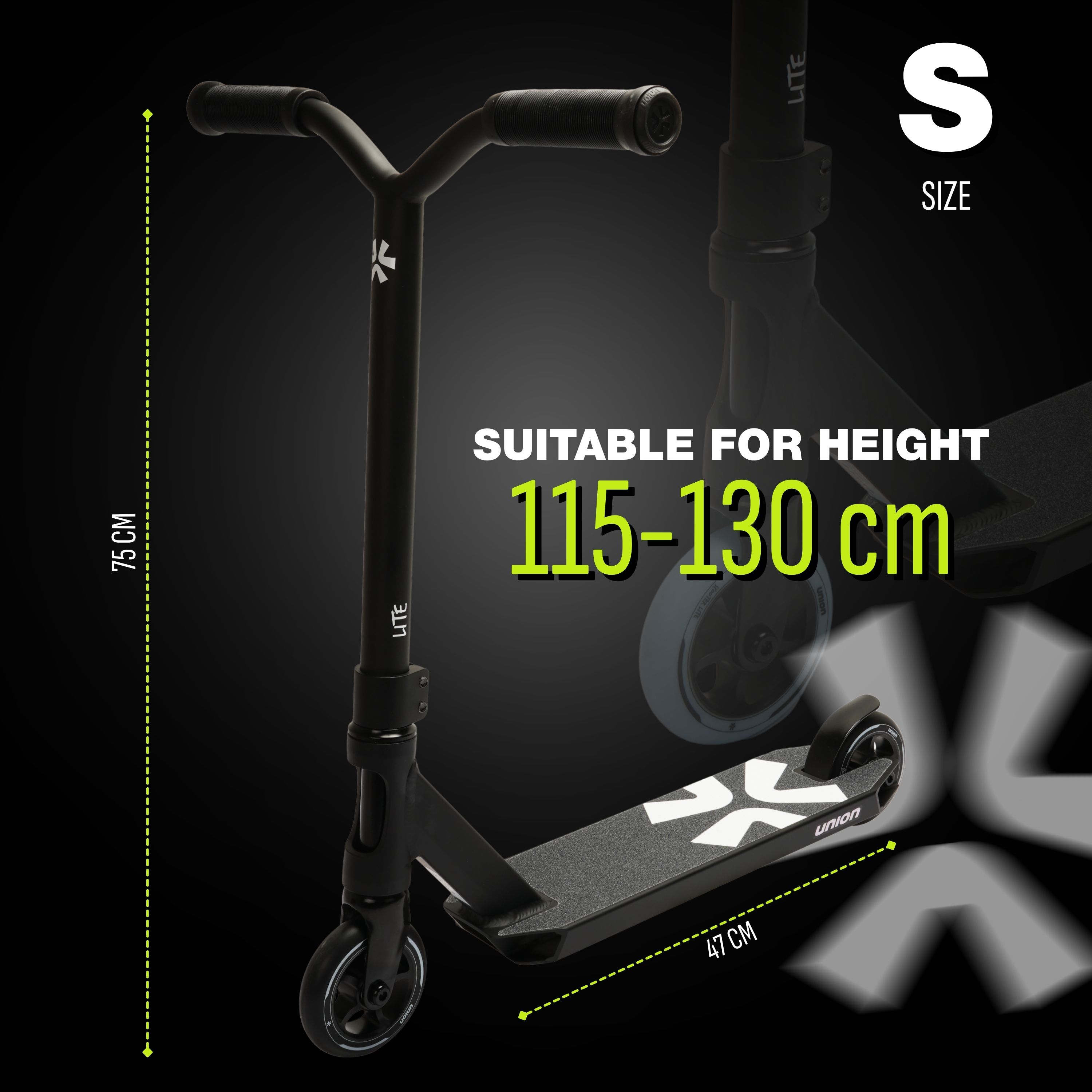 Hulajnoga Union Lite jest produkowana w rozmiarach: XS, S oraz M